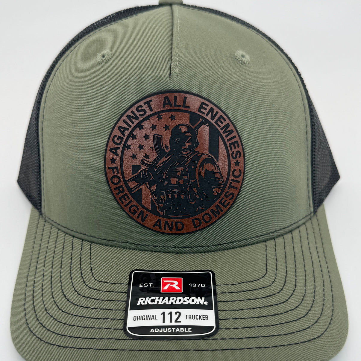 The centerpiece of this hat is the intricately crafted leather patch, laser-engraved with the phrase "Against All Enemies Foreign and Domestic," surrounding a striking graphic of a soldier in full gear. The detailed design symbolizes strength, loyalty, and dedication, making it perfect for those who take pride in their values and service.